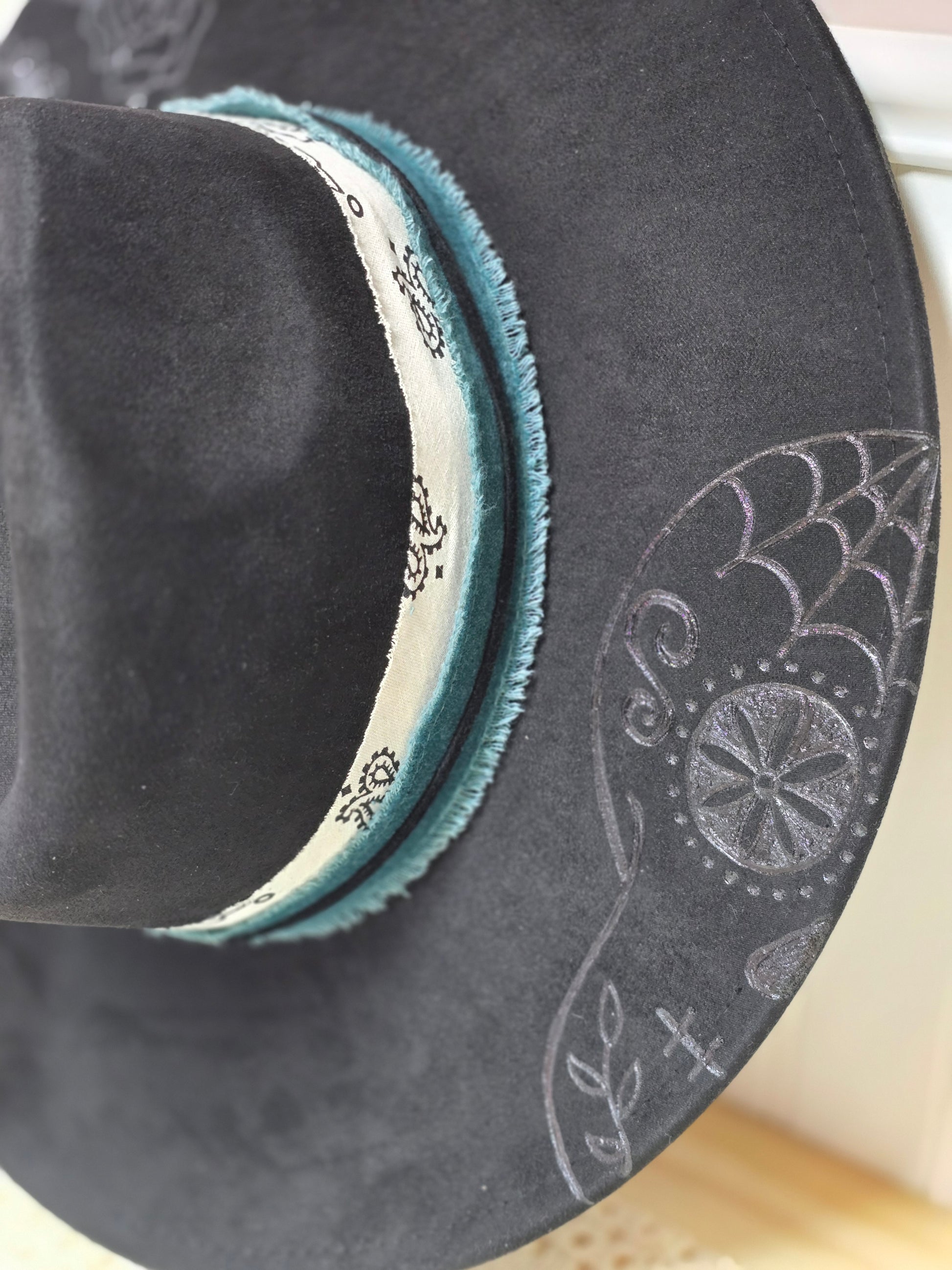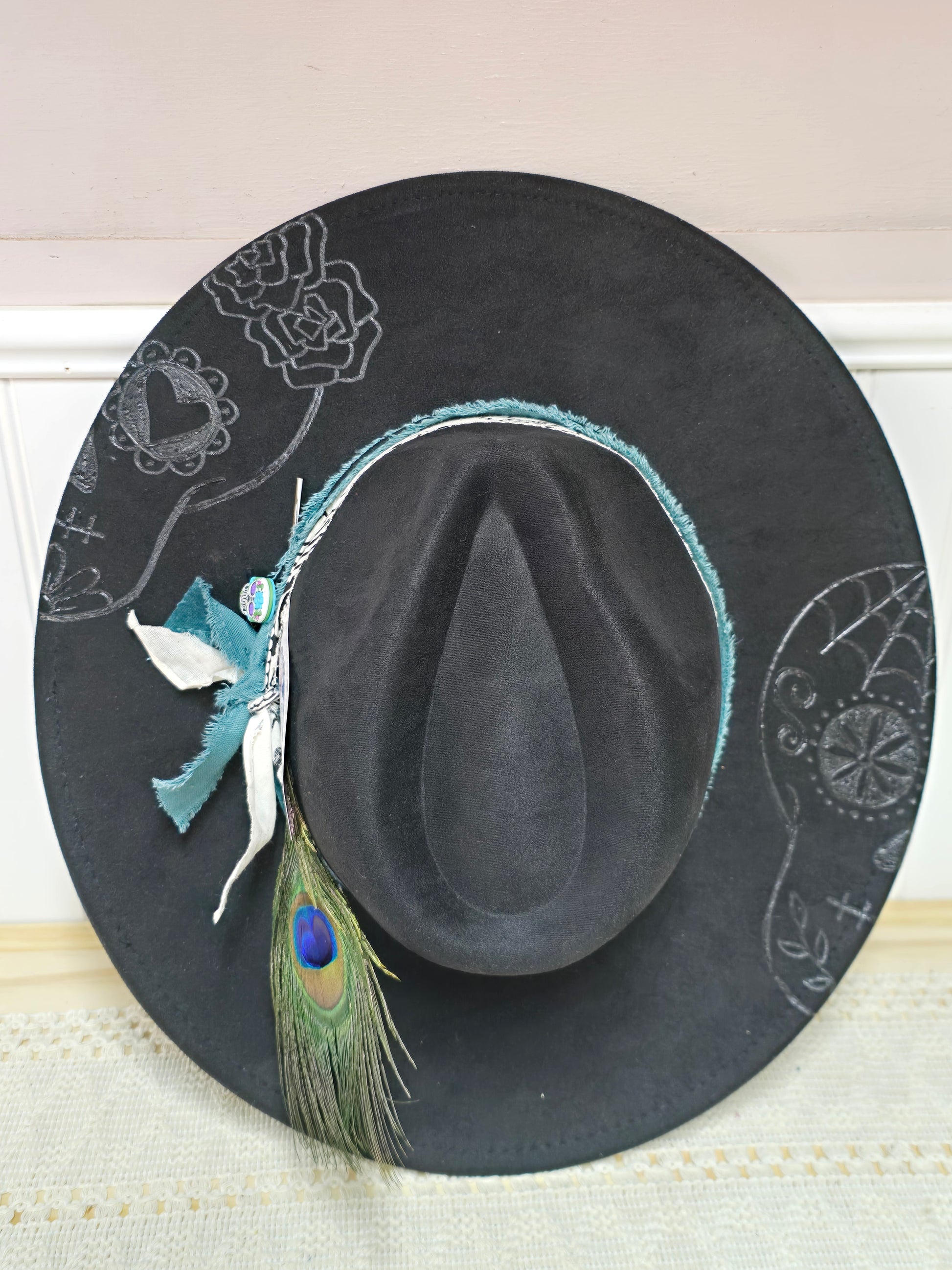 Black vegan suede rancher hat with hand burned sugar skulls. A beautiful deep teal band and a peacock feather complement each other and coordinate with the fun sugar skull playing card and embellishment that accent this hat. One size with adjustable band inside.