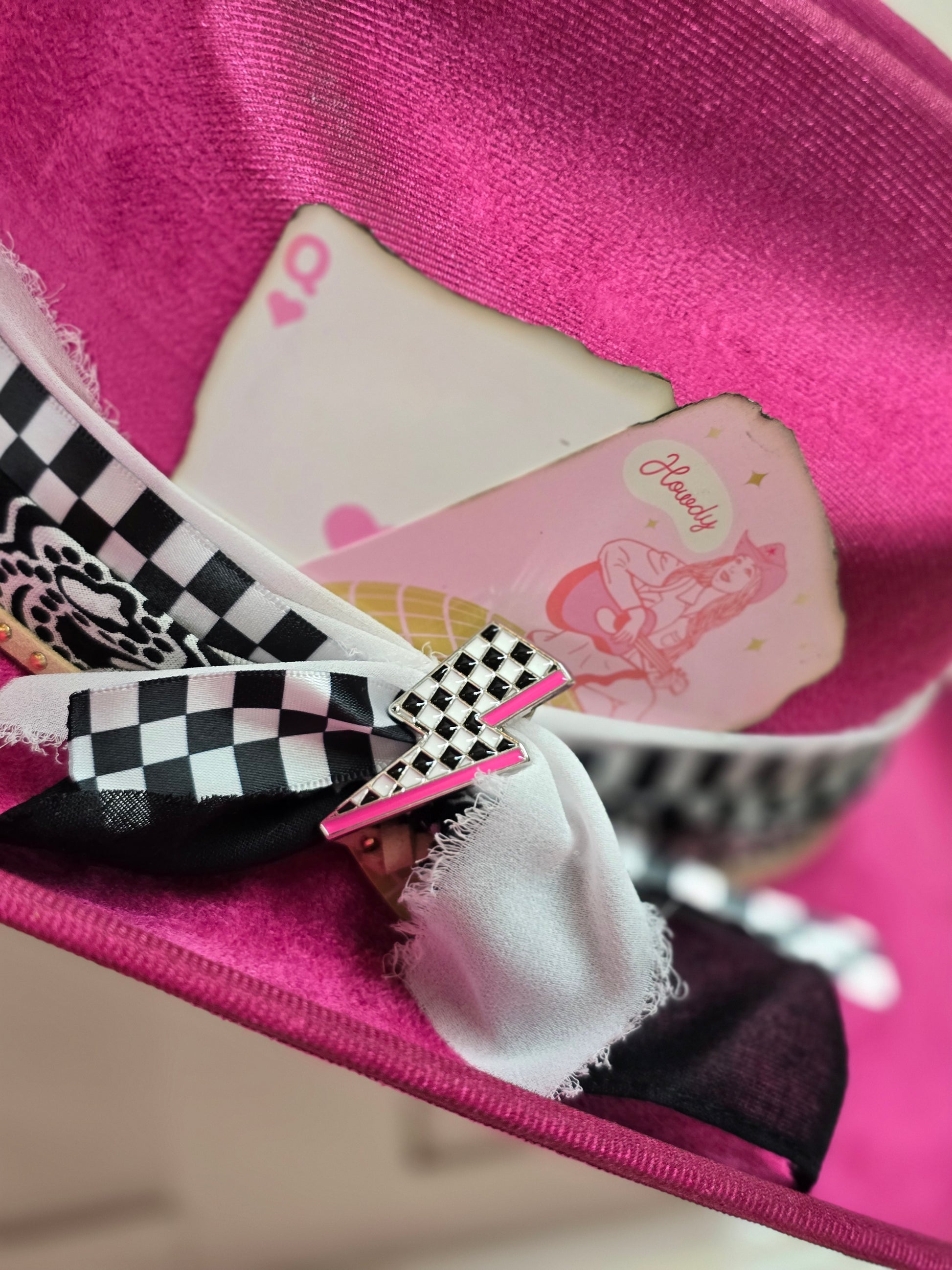 Bold pink vegan suede cattleman style cowboy hat, gently torched on the edges. This hat is embellished with tons of fun, including checkers, studs, themed playing cards, and a coordinating enamel pin! Size Large with an elastic band inside for a comfortable fit.