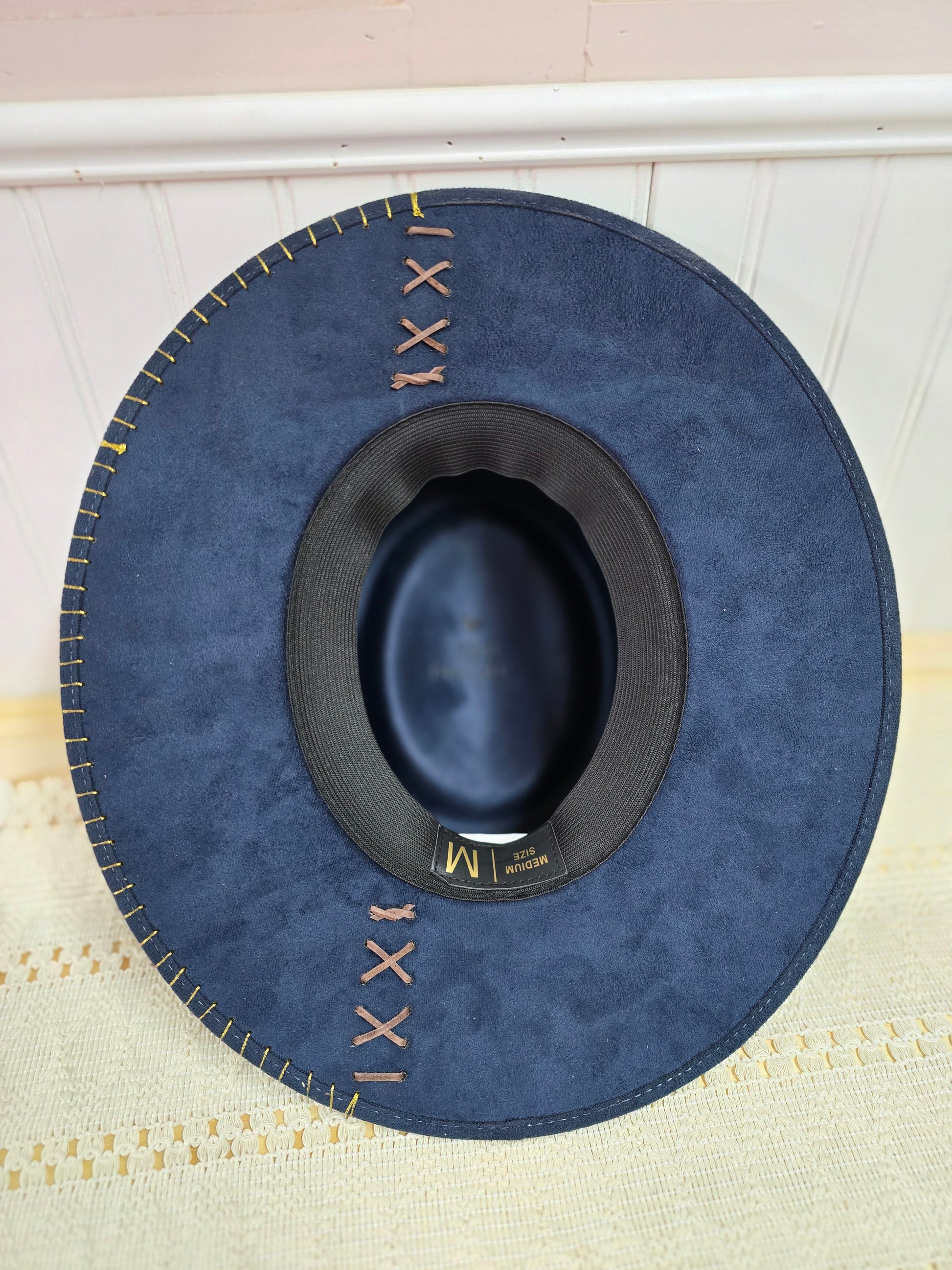 Navy blue vegan suede boater style hat, custom designed from an upcycled designer inspired handbag. All embellishments are cut and stitched onto the hat by hand and include a strap and decorative rivets from the handbag. Size medium with an elastic band inside.