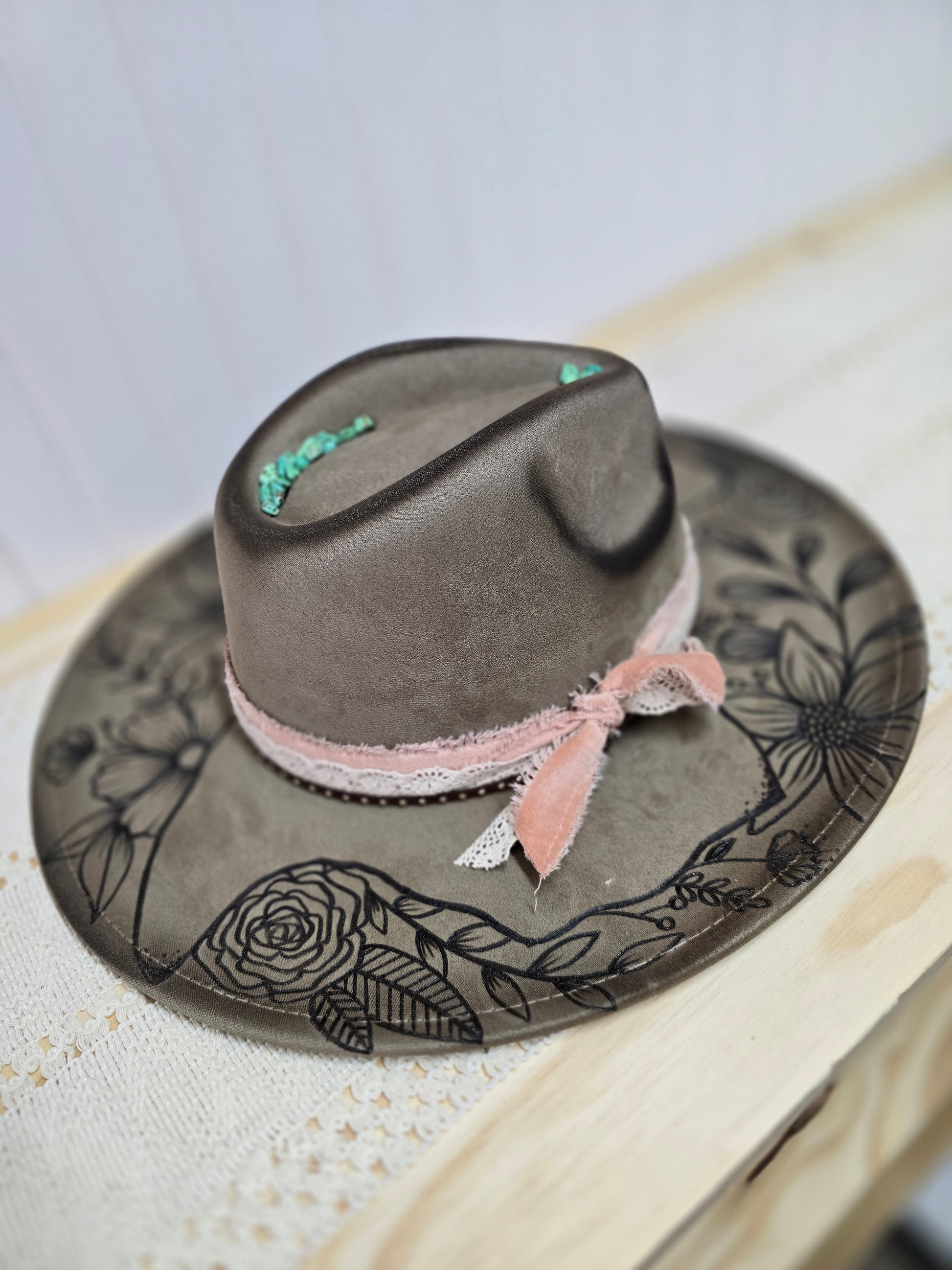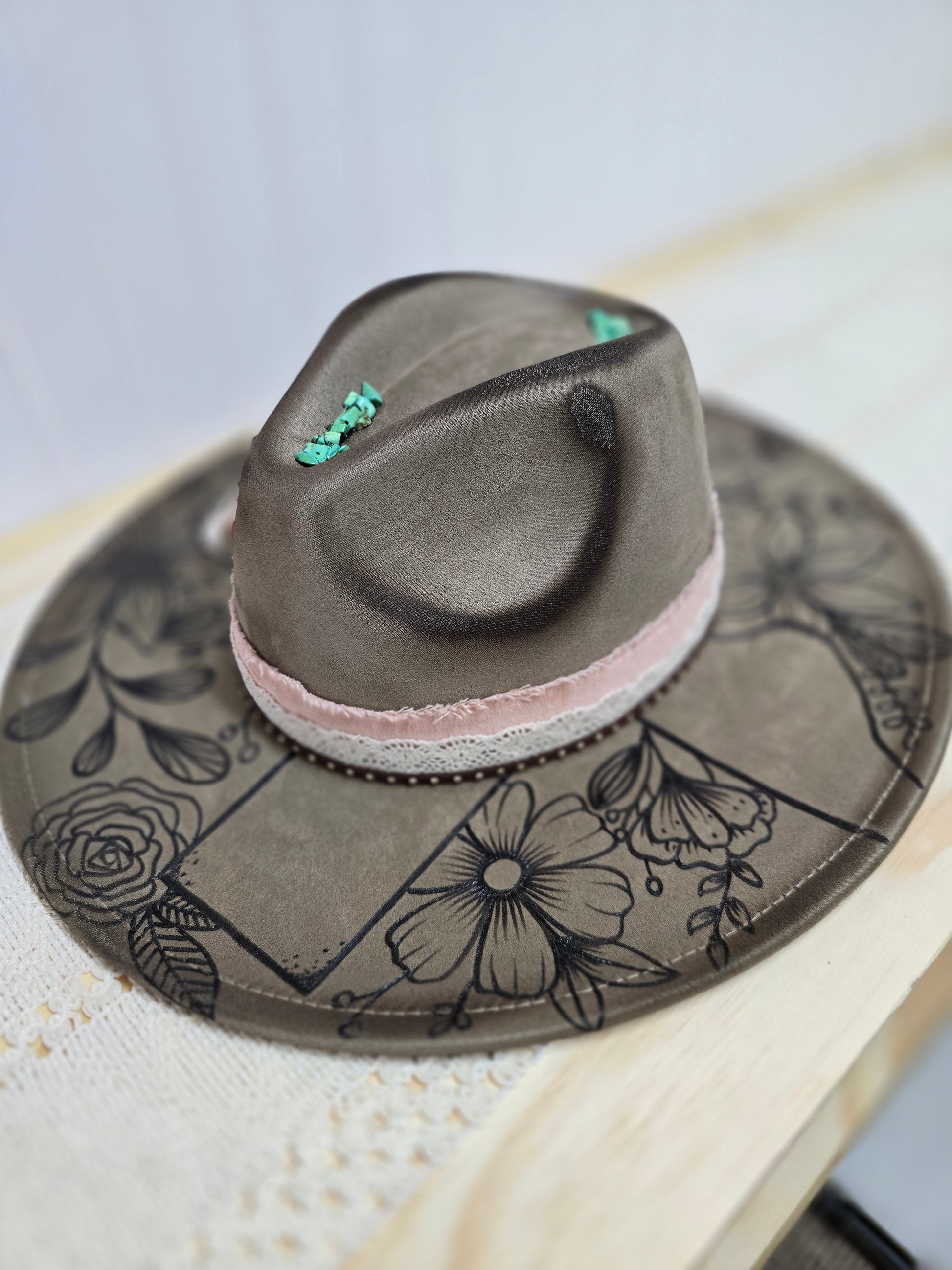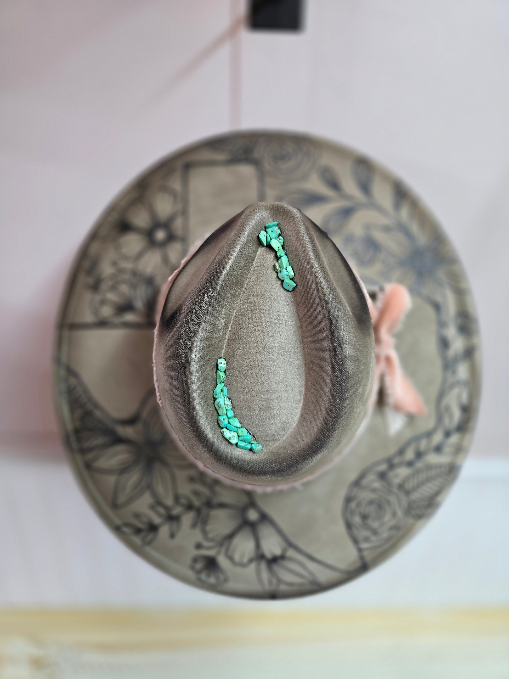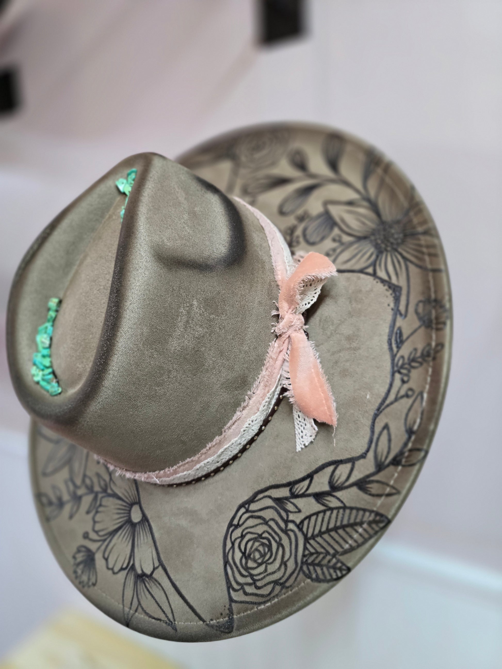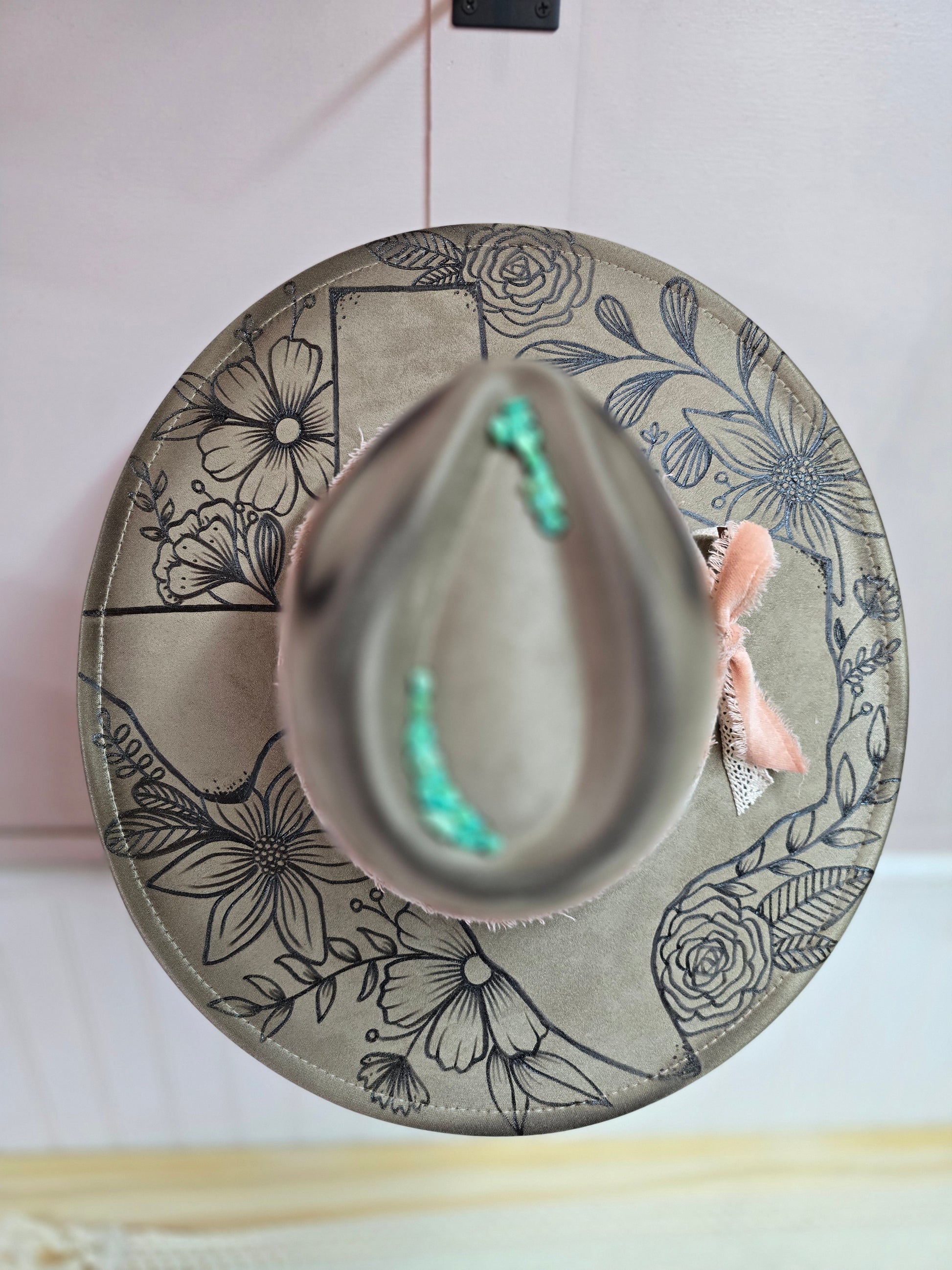 Olive colored vegan suede rancher hat with elaborate Texas and floral design on full top of brim. Top of crown is adorned with turquoise colored stones, edges are gently torched, and hat is finished off with simple and elegant bands that complement the design. One size with adjustable band inside.
