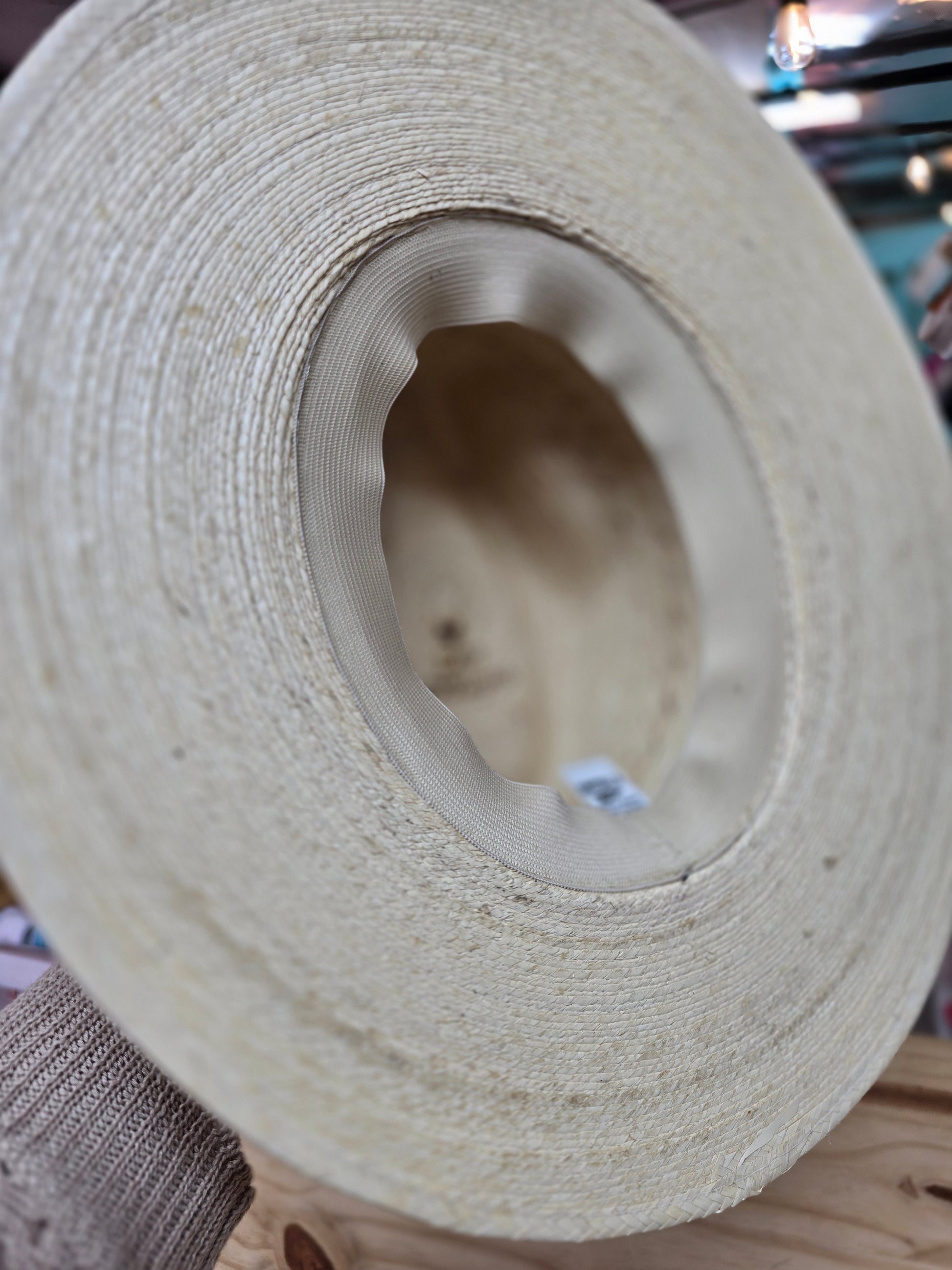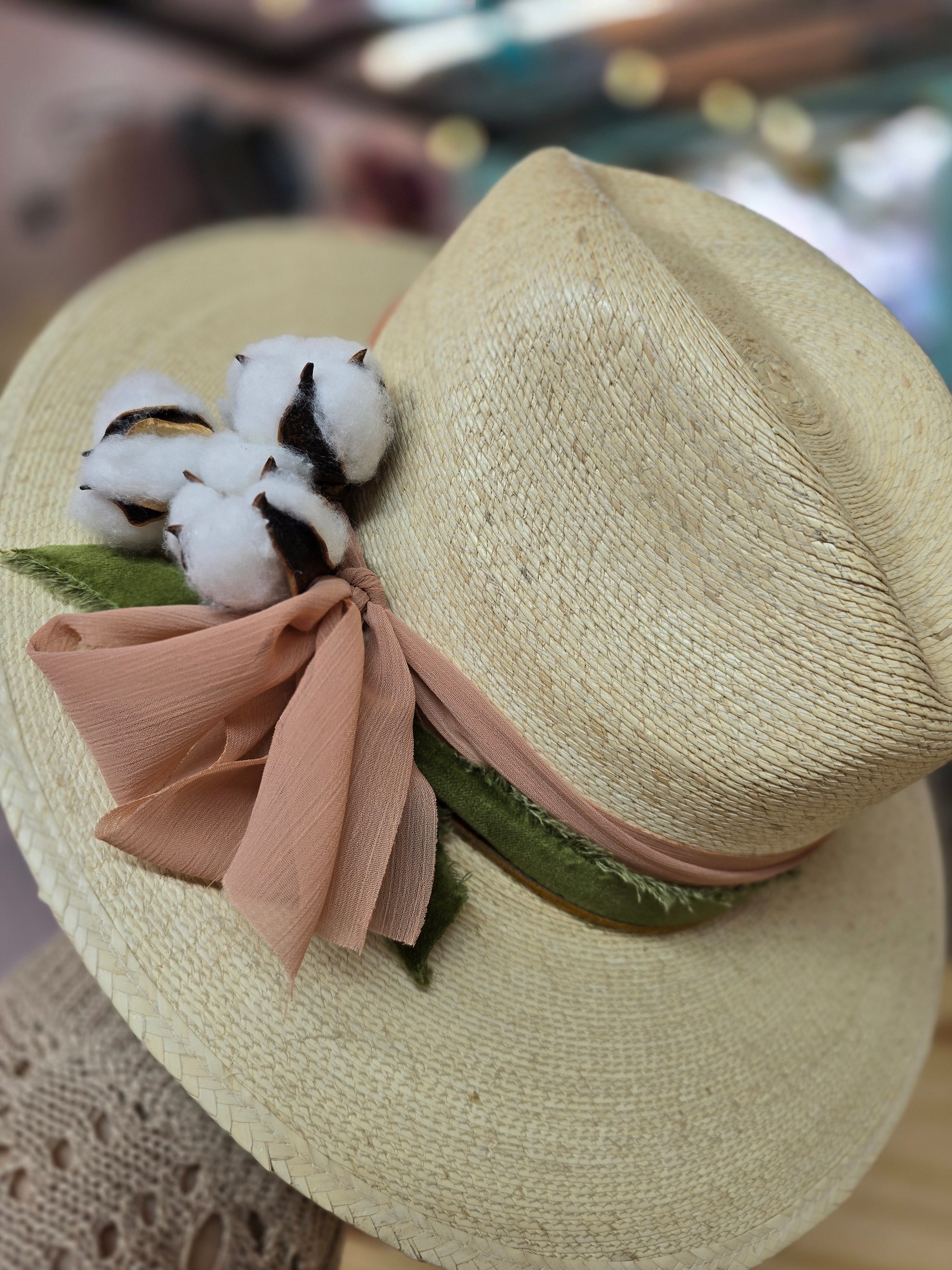 Palm straw rancher style hat accented with beautiful dusty pink, olive green, and brown bands, and finished simply with a bow and a cotton stem. One size with an elastic band inside for a comfortable fit.