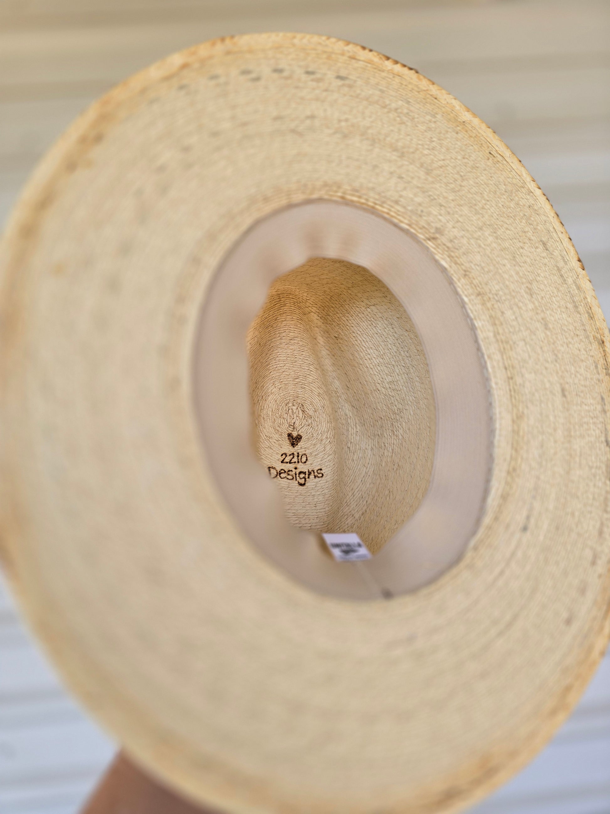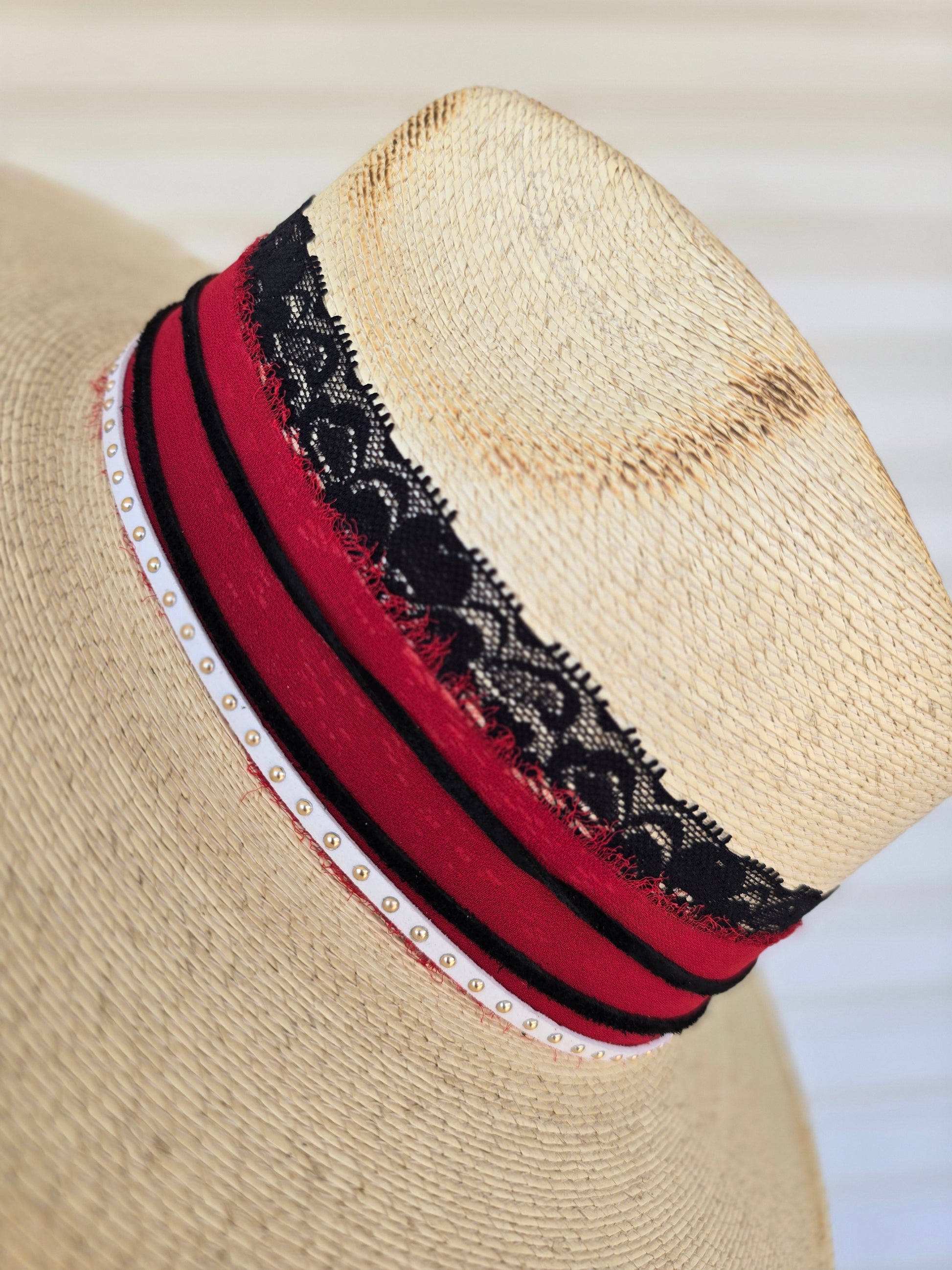 Palm straw rancher style hat with fun red and black accents including lace, suede, feathers, a beautiful silver Texas charm, and a Texas Tech playing card. Gently torched around the edges. This hat is the perfect accessory to keep the sun off your face while looking stylish for game day! One size with an elastic band inside for a comfy fit.
