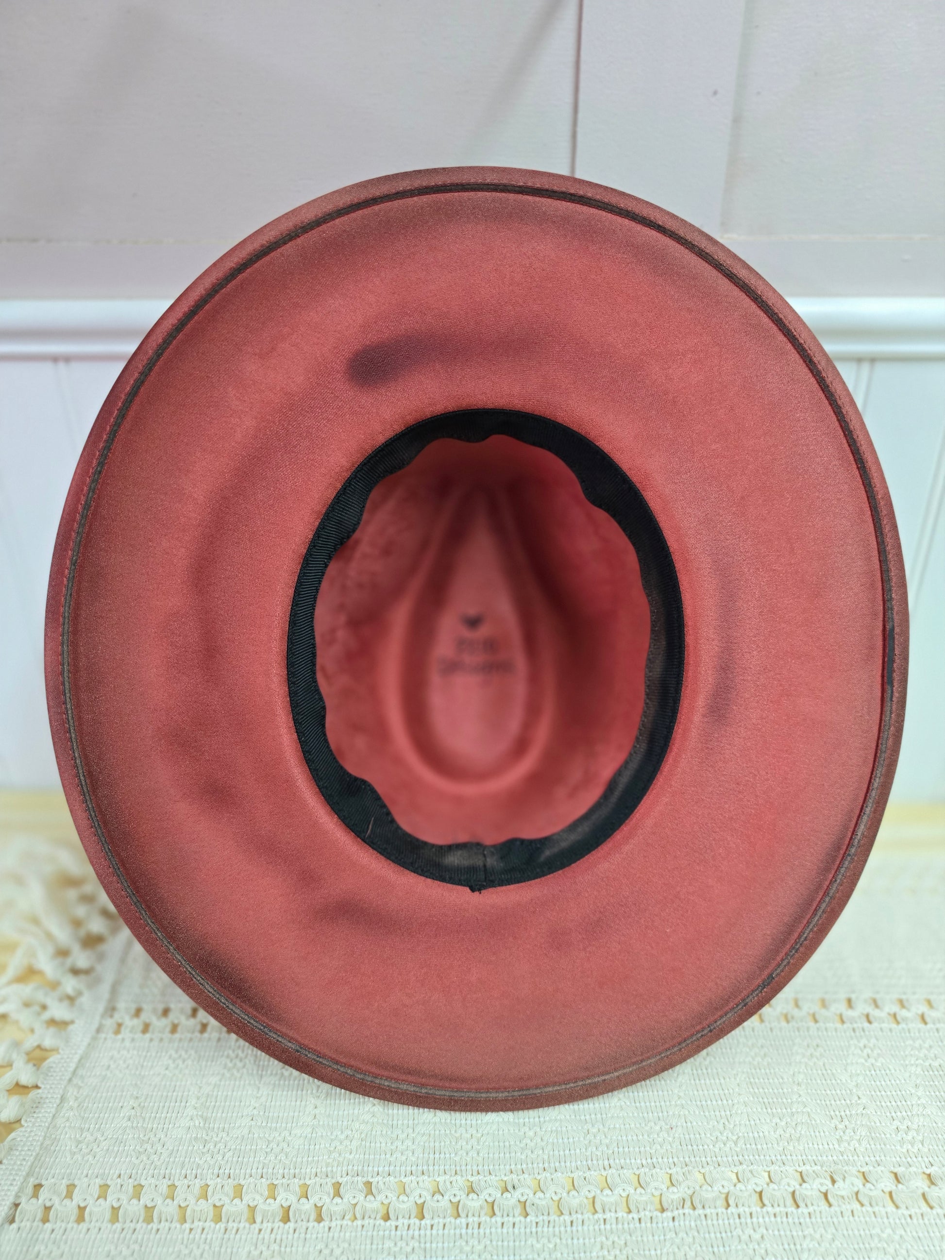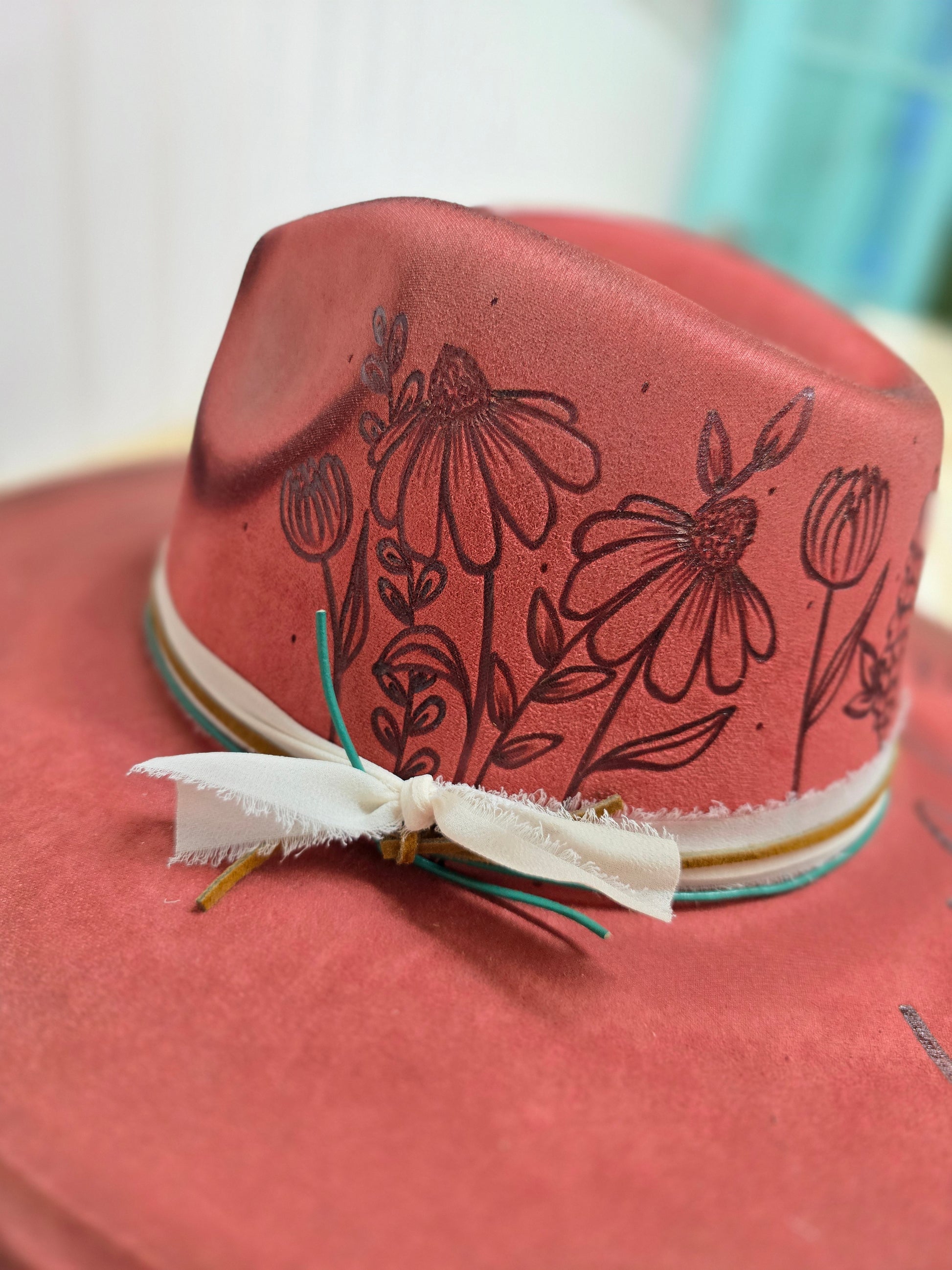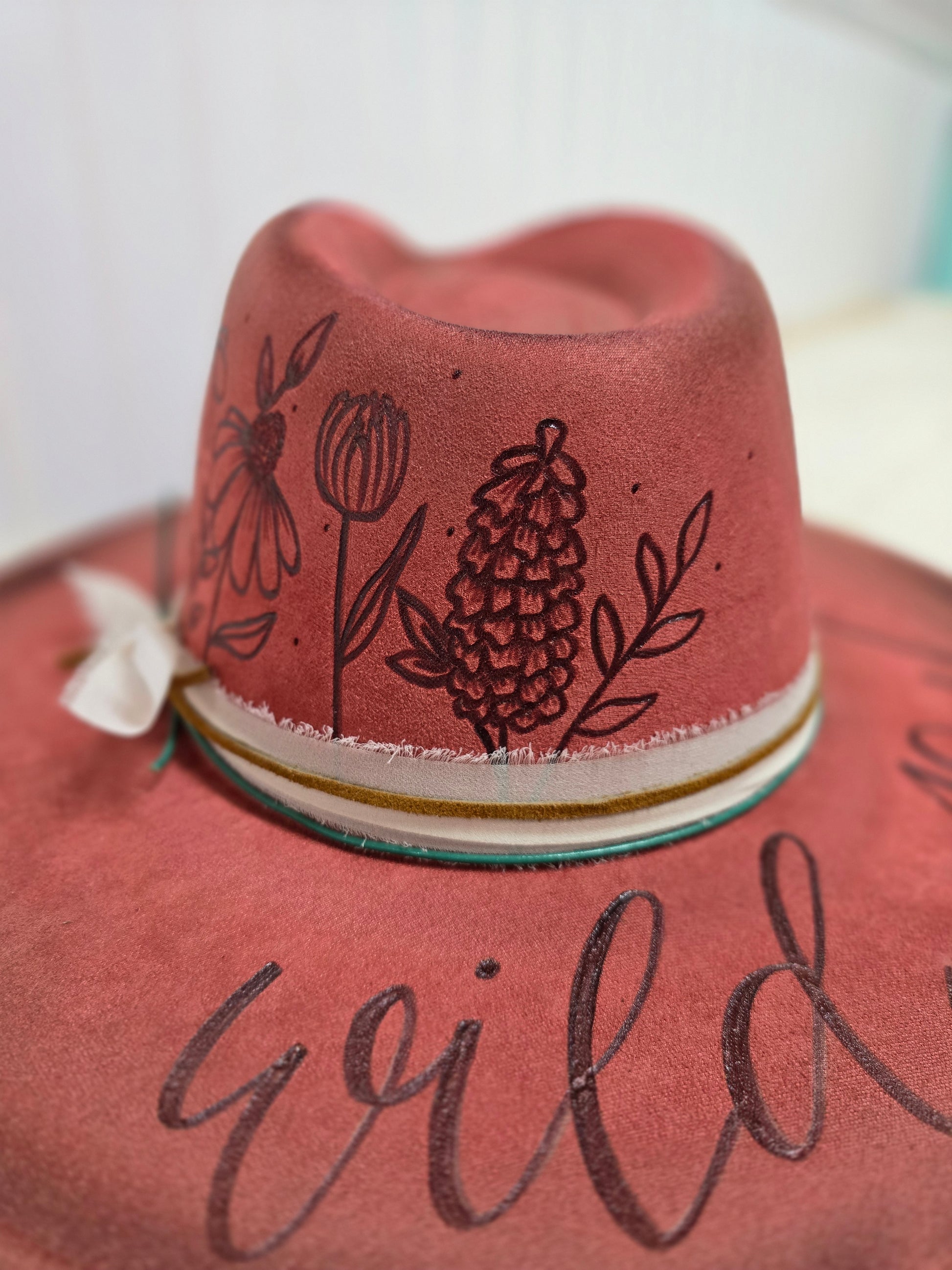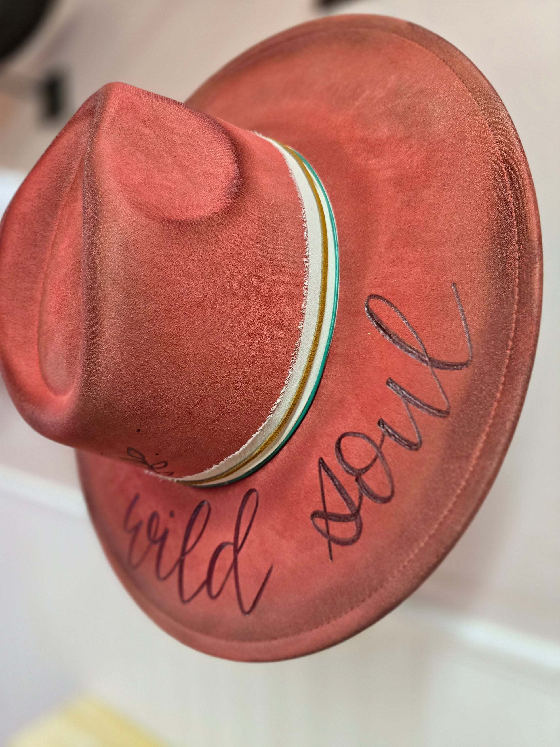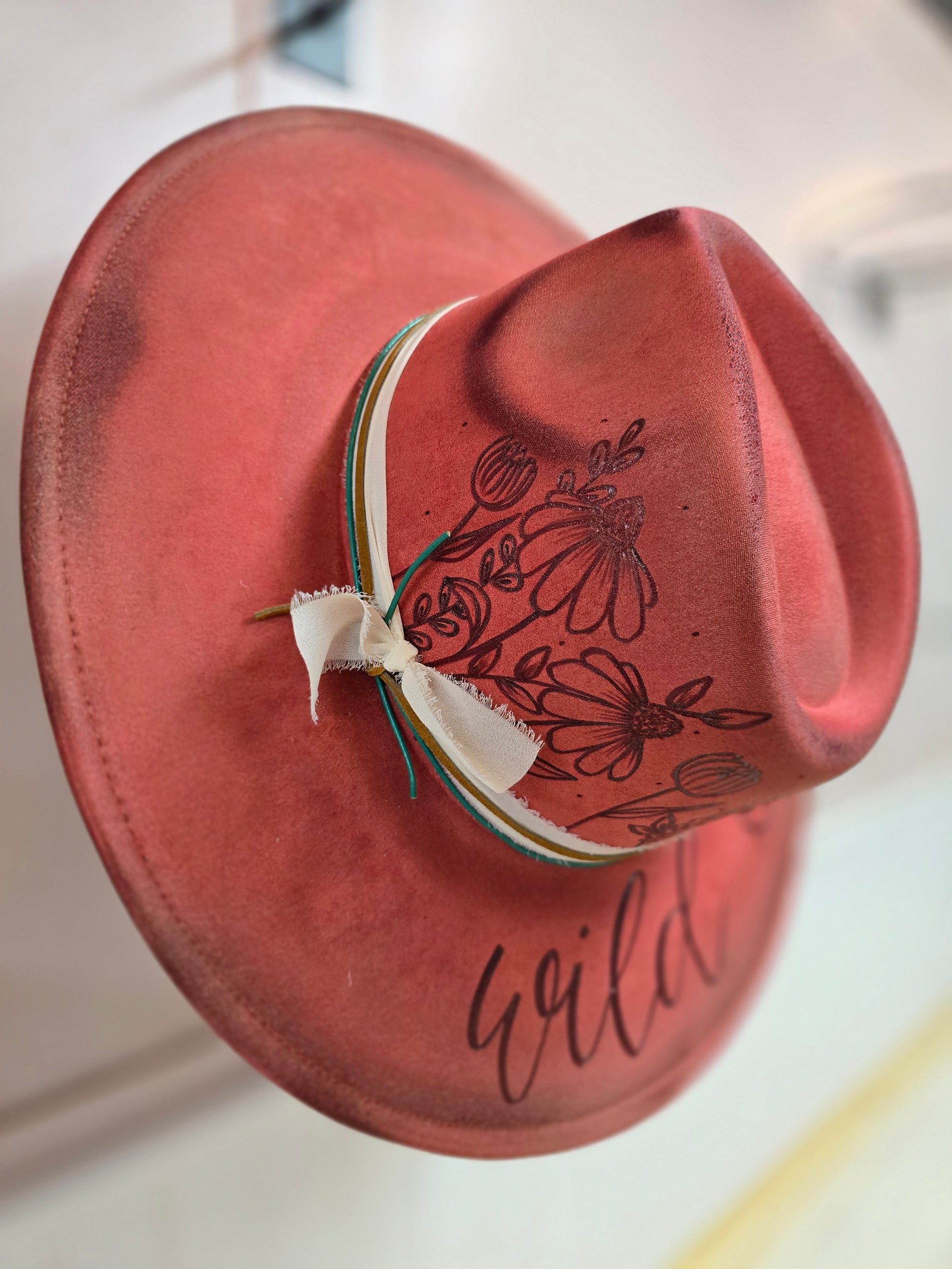 Rust colored vegan suede rancher, hand burned with floral design on side of crown, and "wild soul"on brim. Moderately torched and accented with complementary bands. One size with adjustable band inside.